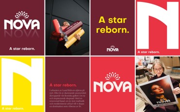 Färgpaletten hämtar sin värme från ljus och rörelse. Nyanser av burgundy, gult och rött skapar tillsammans energi och glöd. Retail är underhållande och vi vill att loggan ska bära den känslan. Varje dag på Nova ska kännas som nya möjligheter, med glimten av showbiz och en vilja att överraska och bjuda våra besökare på upplevelser.